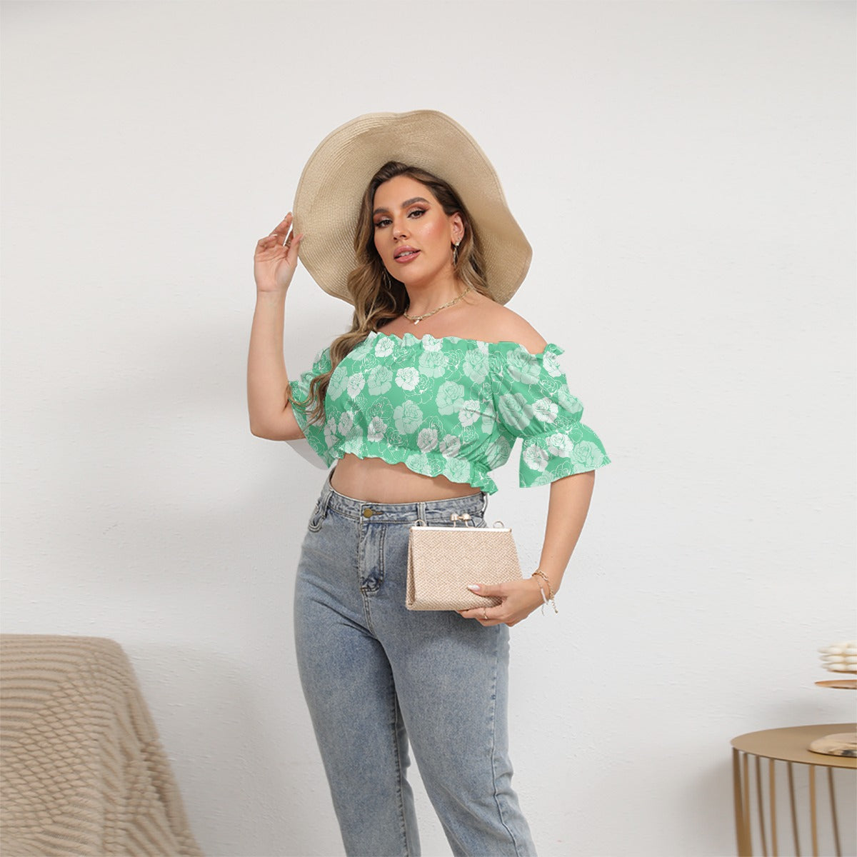 White Roses With Teal Women's Off-shoulder Cropped Top With Short Puff Sleeve