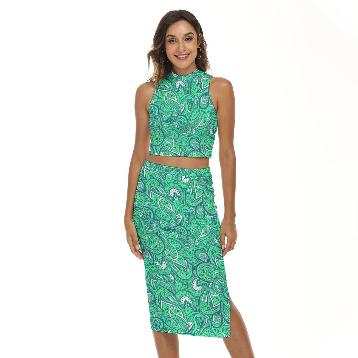 Teal Paisley Pattern Women's Tank Top & Split High Skirt Set
