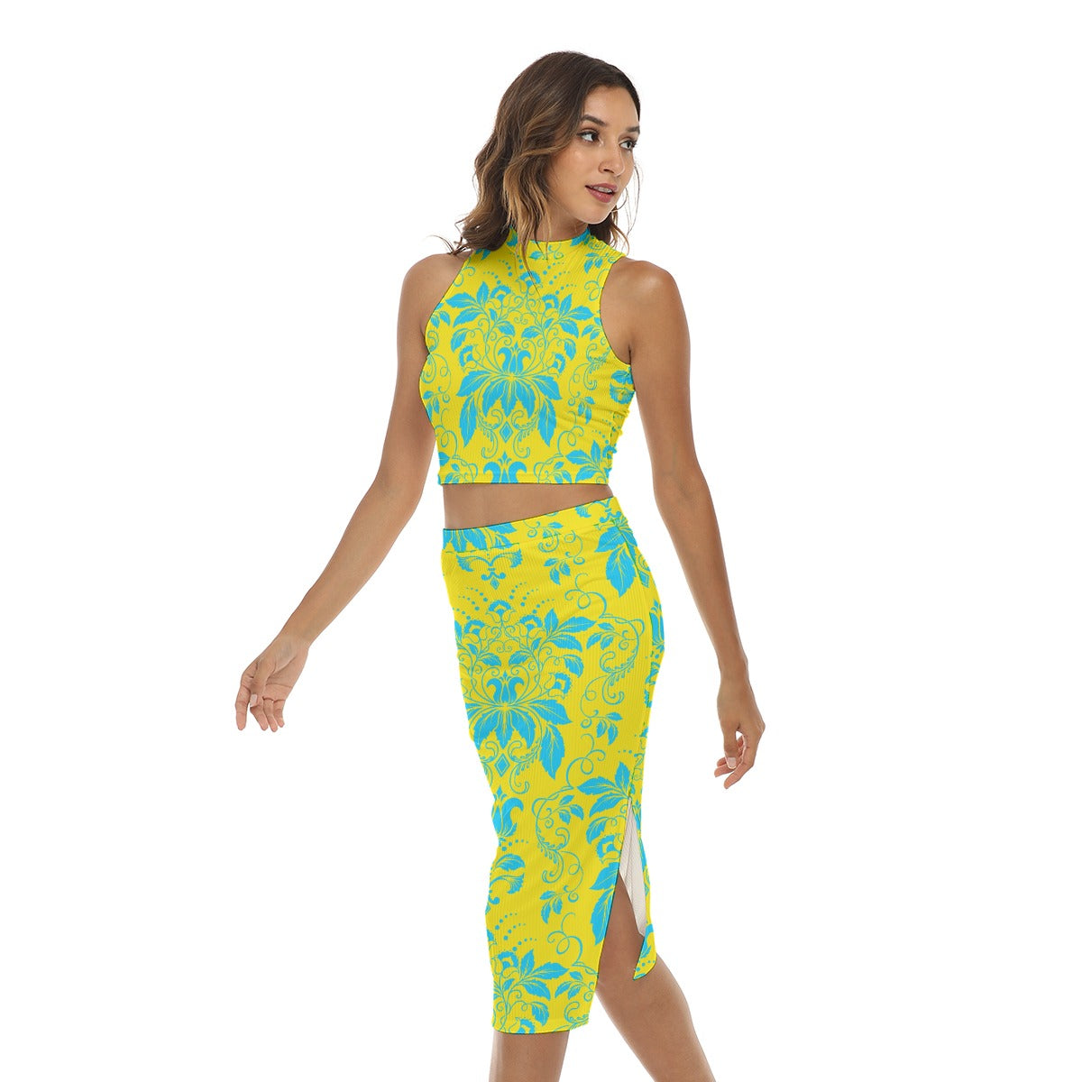 Blue With Yellow Vintage Flowers Women's Tank Top & Split High Skirt Set