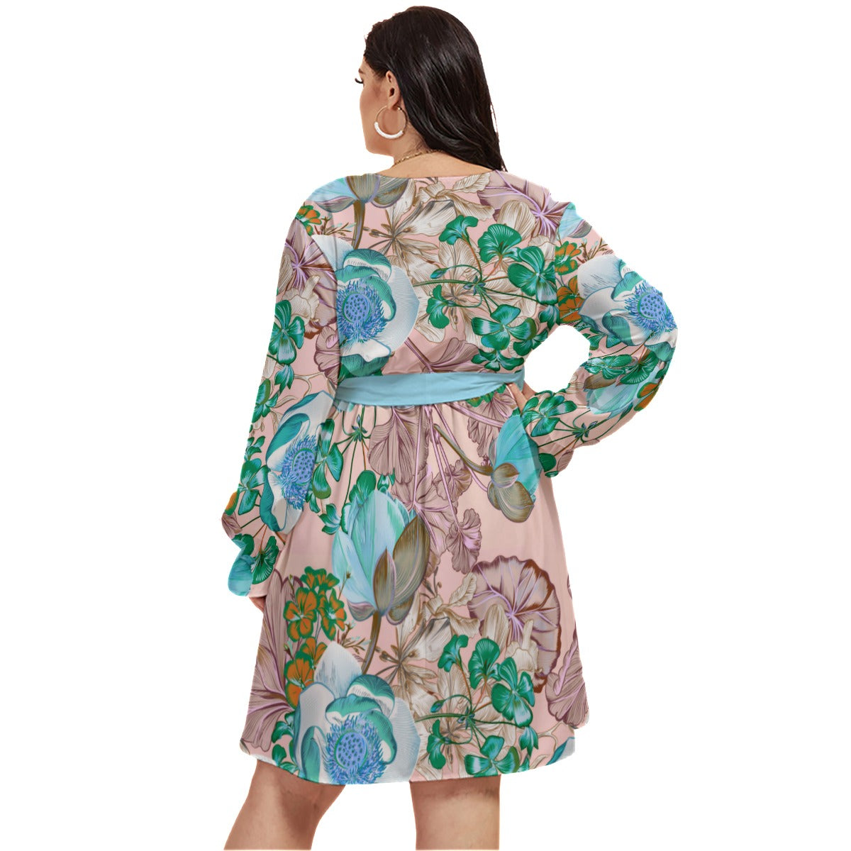 Beautiful Flowers Women's V-neck Dress With Waistband (Plus Size)