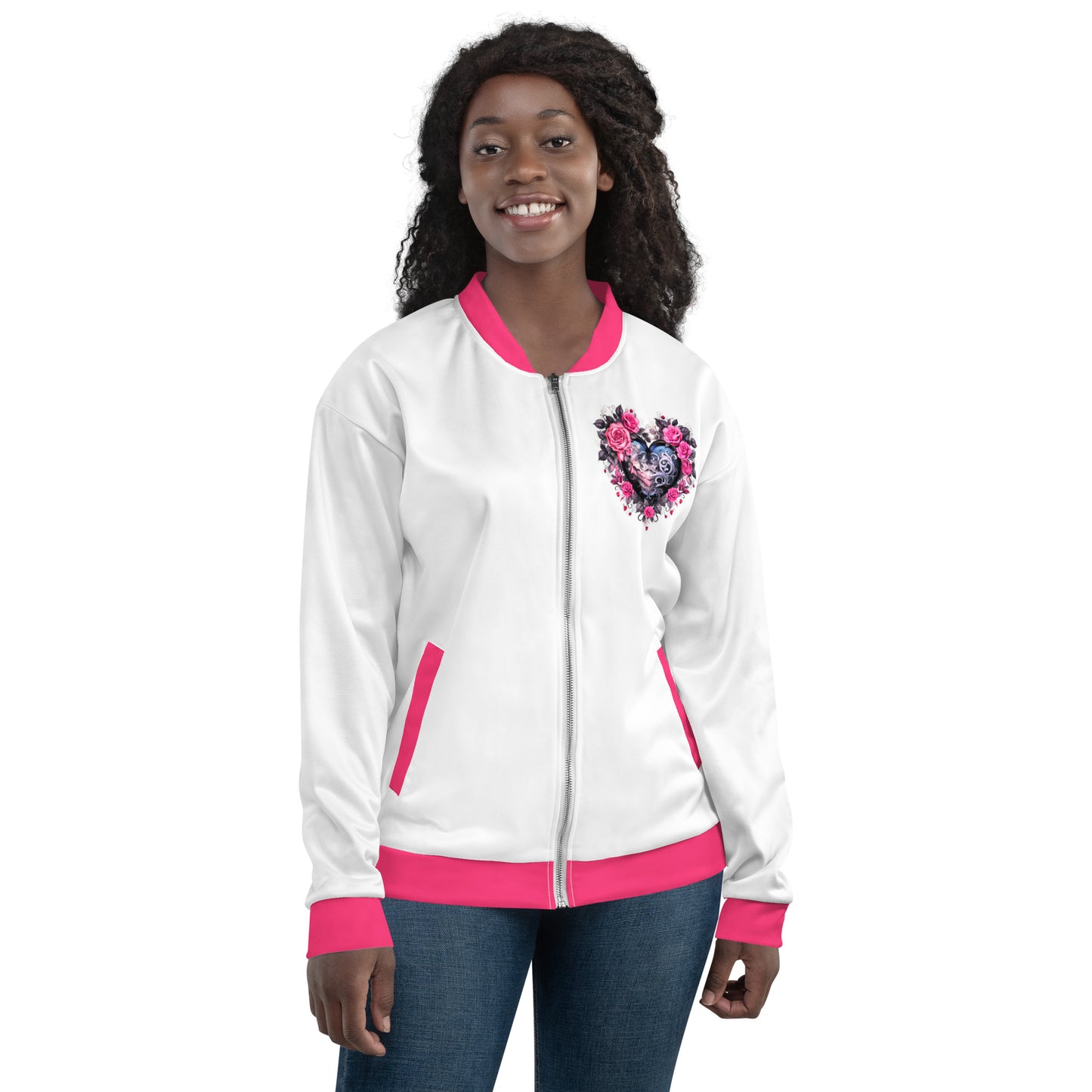 Add a little zing to your wardrobe with this vibrant Gothic Hearts Bomber Jacket. Wear it on a basic t-shirt, or layer it on top of a warm hoodie—it’ll look great either way. With a brushed fleece inside, and a relaxed unisex fit, this Bomber Jacket is just the stuff of the dreams, so be quick to grab yourself one!