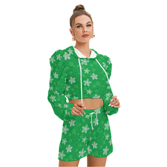 Green With White Roses Women's Crop Hoodie Sports Sets
