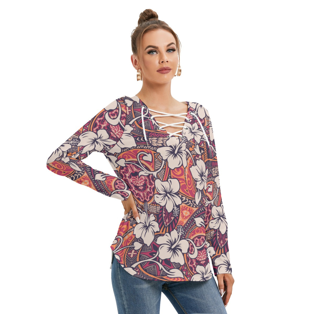 Tropical Hibiscus Flower With Tapa Tribal Designs Women's Long Sleeve Neckline Tie Sweatshirt